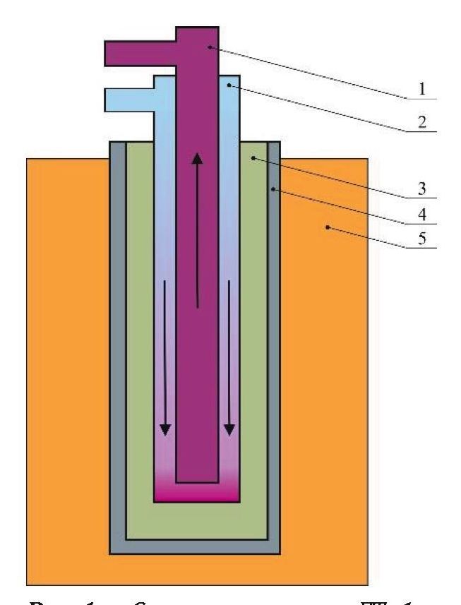 Рис. 1. Схема скважины с ГТ: 1 – внутренняя труба; 2 – кольцевой канал; 3 – засыпка; 4 – обсадная колонна; 5 – горячие породы