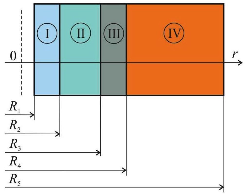 Рис. 2. Схема области решения: I – внешняя труба кольцевого канала ГТ; II – засыпка; III – обсадная колонна; IV – горячие породы