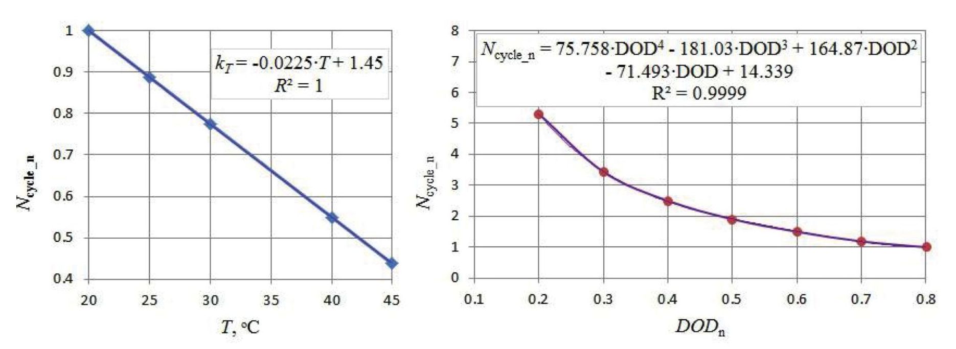 Результаты многочисленных исследований показали, что основными стресс-факторами, влияющими на срок жизни АКБ, являются температура T, глубина разряда DOD (Depth of Discharge) и число рабочих циклов Ncycle. Большинство производителей АКБ в паспортах технической спецификации предоставляют характеристики их срока службы, выраженные в числе рабочих циклов, в зависимости от глубины разряда Ncycle=f(DOD) и температуры Ncycle=f(T), например, [27].