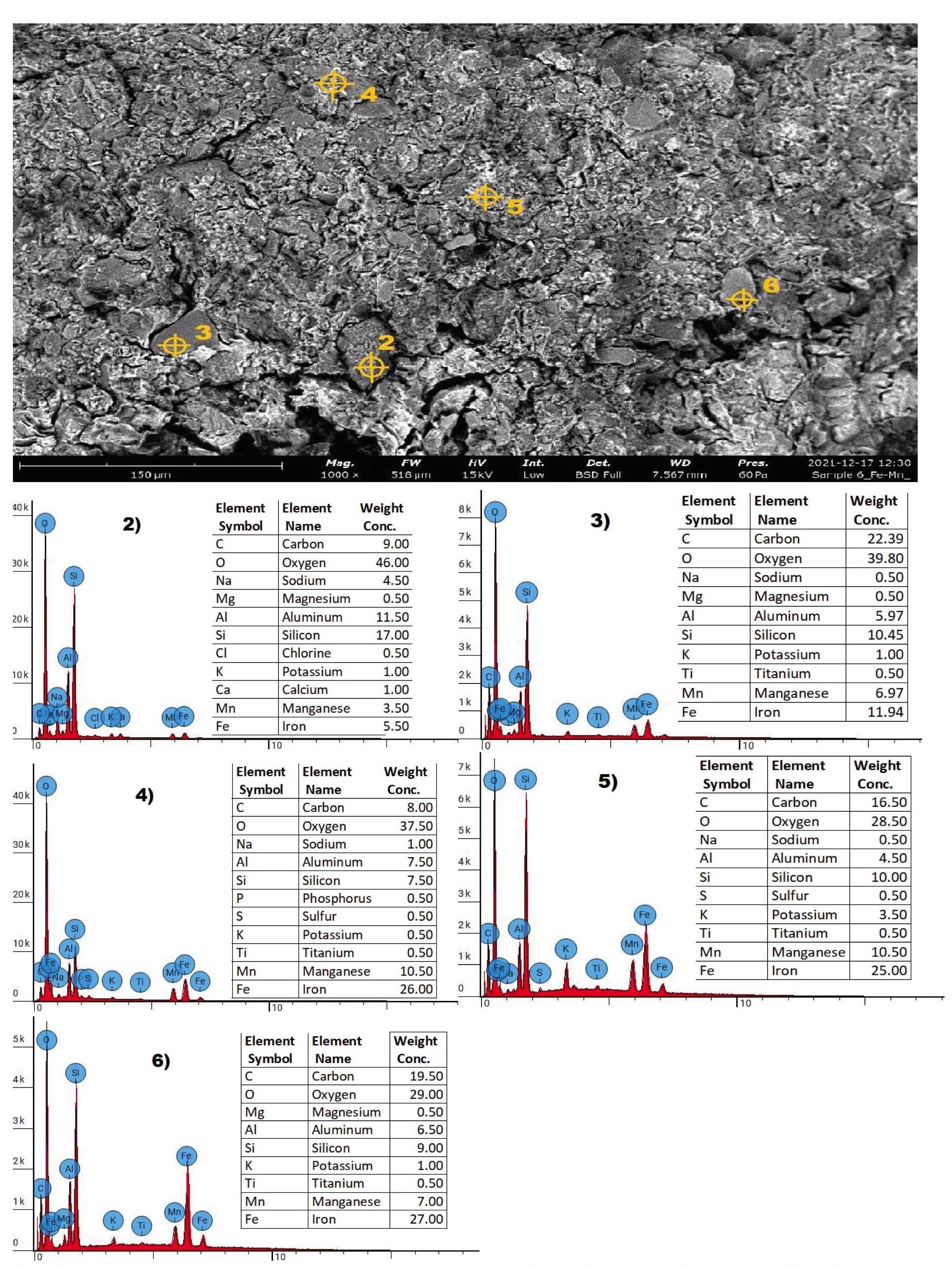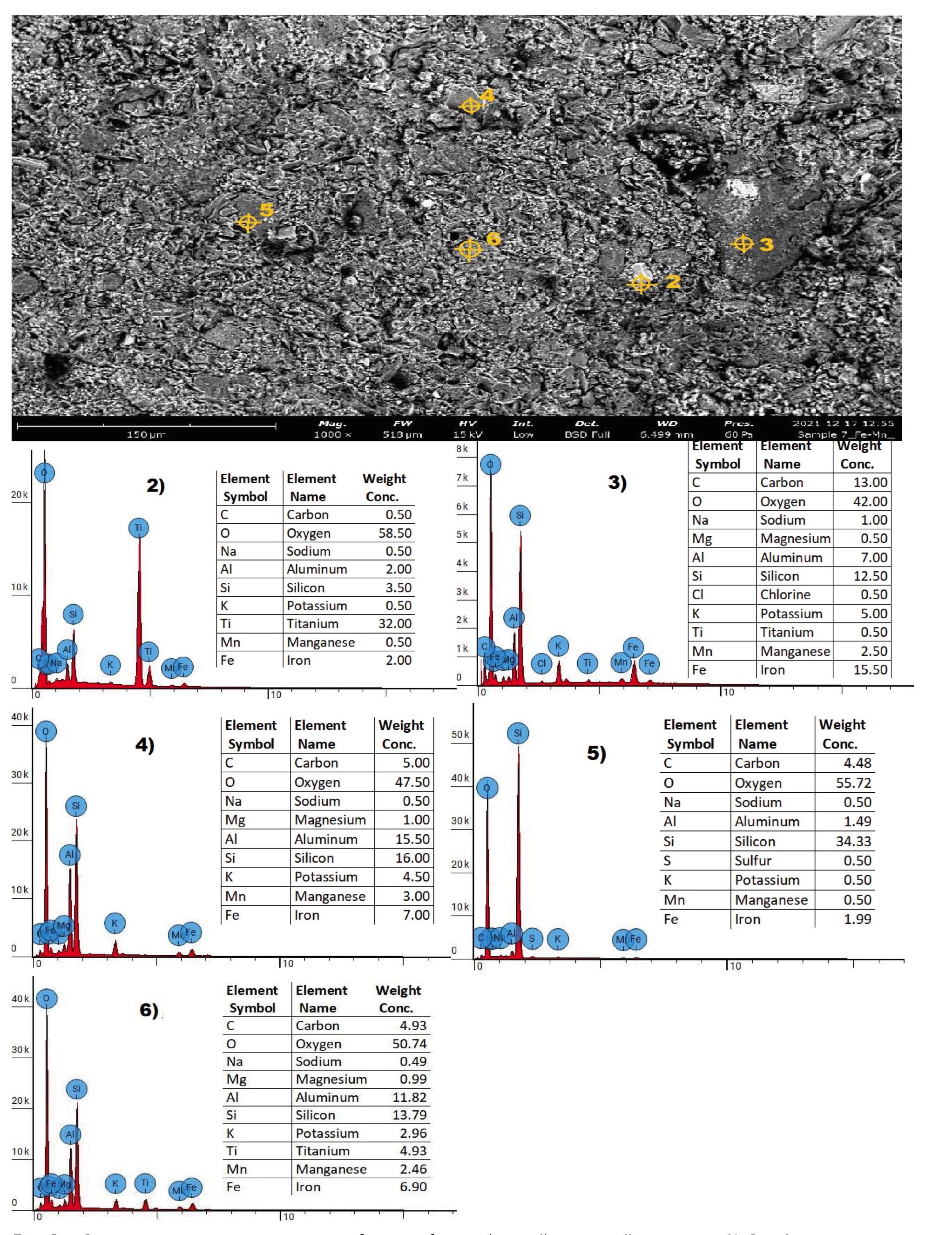 На рис. 2 изображены снимки ортштейнов, полученных структурной электронной микроскопией с точки обора 3/8 и глубины 1–15 см – серогумусовый горизонт, на рис. 4 ортштейны из разреза № отбора 3/8 с глубины 15–30 см – элювиальный горизонт. Во всех изученных образцах на свежем изломе концентрической структуры не обнаружено. Материал ортштейнов состоит из органического, аморфного и кристаллического вещества. По данным EDXзонда основными химическими элементами являются О, C, Si, Fe, Al и Mn. На общем фоне отчетливо выделяются крупные кристаллические зоны 2, 3, 4 и 6 (рис. 2) и 2, 3, 4 и 5 (рис. 3), представленные первичными минералами. При визуальном осмотре с использованием микроскопа идентифицирован кварц, по данным расчетов – санидин и анортит. Цементирующим материалом являются аморфные изотропные формы железа и марганца. Они заполняют пустоты и трещины ортштейна и покрывают тонкой пленкой первичные минералы, по данным структурных расчетов представлены якобситом и маггемитом. Содержание железа в пределах от 5,5 до 27 %, марганца – от 3,5 до 10,5 %. Кроме этого, обнаруживается высокое содержание органического вещества.