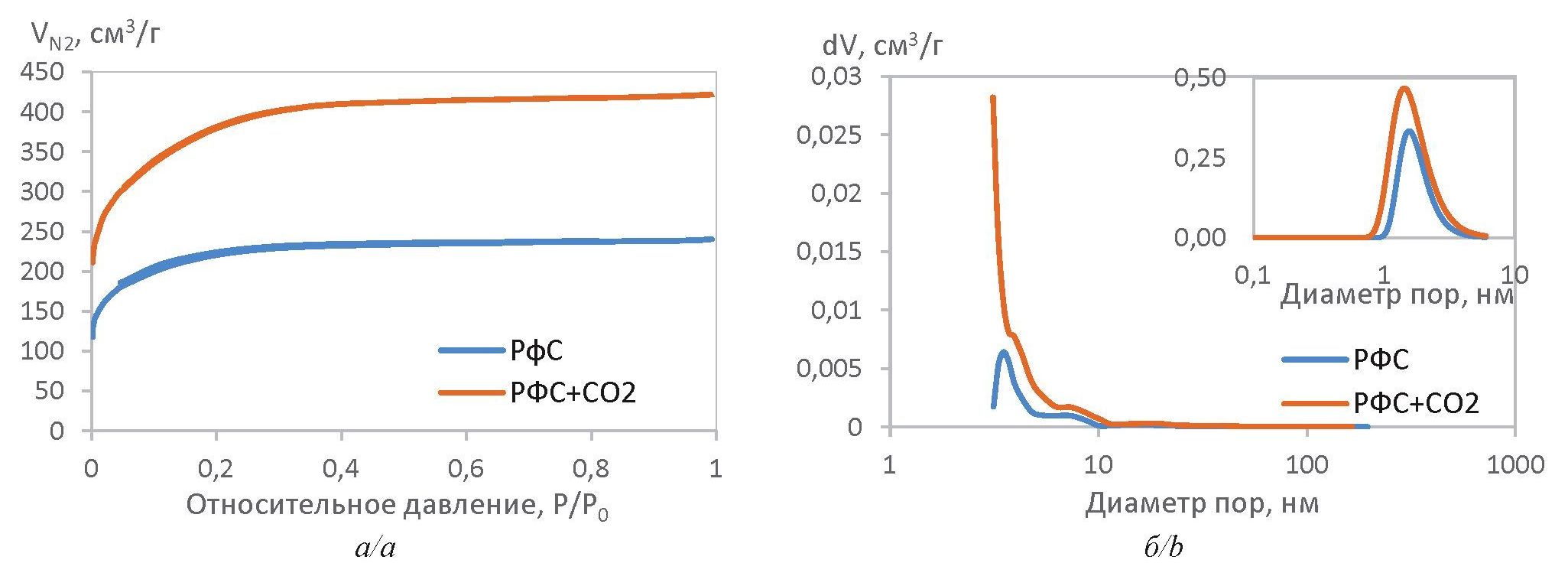 Исследование влияния физической активации с применением активирующего газа CO2 на пористую структуру и состояние поверхности образцов РФС проведено при помощи методов BET и BJH. Как показано на рис. 2, a, для обоих материалов измеряемая величина быстро возрастает в интервале низких давлений <0,3 P/P0, указывая на то, что поверхность образцов принадлежит к H1 типу петель гистерезиса (согласно классификации IUPAC), что характерно для адсорбции в микропорах. Эти данные согласуются с данными кривых распределения пор по размерам, представленными на рис. 2, b. В действительности практически все поры, сформировавшиеся в процессе изготовления РФС и РФС+CO2, являются микропорами. Полученные результаты измерений свидетельствуют о довольно узком интервале распределении пор по размерам: диаметр пор изменяется от 0,7 до 3 нм (Dмезо=2–50 нм).