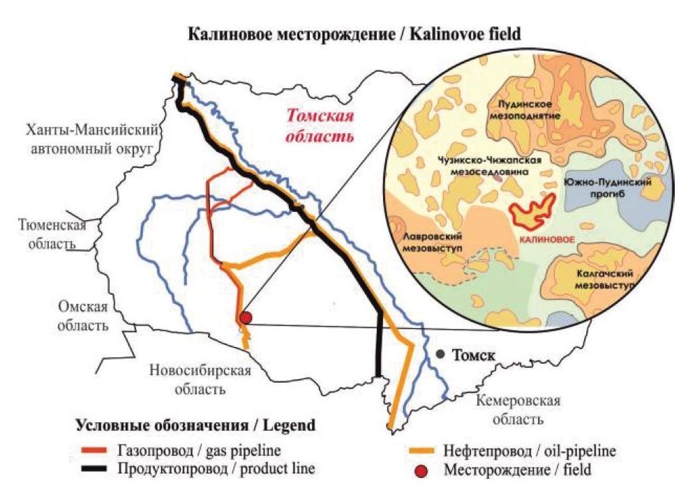 Калиновое НГК месторождение находится в пределах Чузикско-Чижапской зоны нефтегазонакопления, расположенной на юго-востоке ЗС в Парабельском районе Томской области. Чузикско-Чижапская мезоседловина, являясь зоной сочленения Лавровского мезовала и Пудинского мезоподнятия, осложнена значительным количеством локальных поднятий, в отложениях которых открыты месторождения нефти и газа в НГГЗК (рис. 1). Нефтяная залежь в выветрелых отложениях Калинового локального поднятия развита только на западном куполе и представлена интенсивно измененными породами глинисто-кремнистого состава [34].