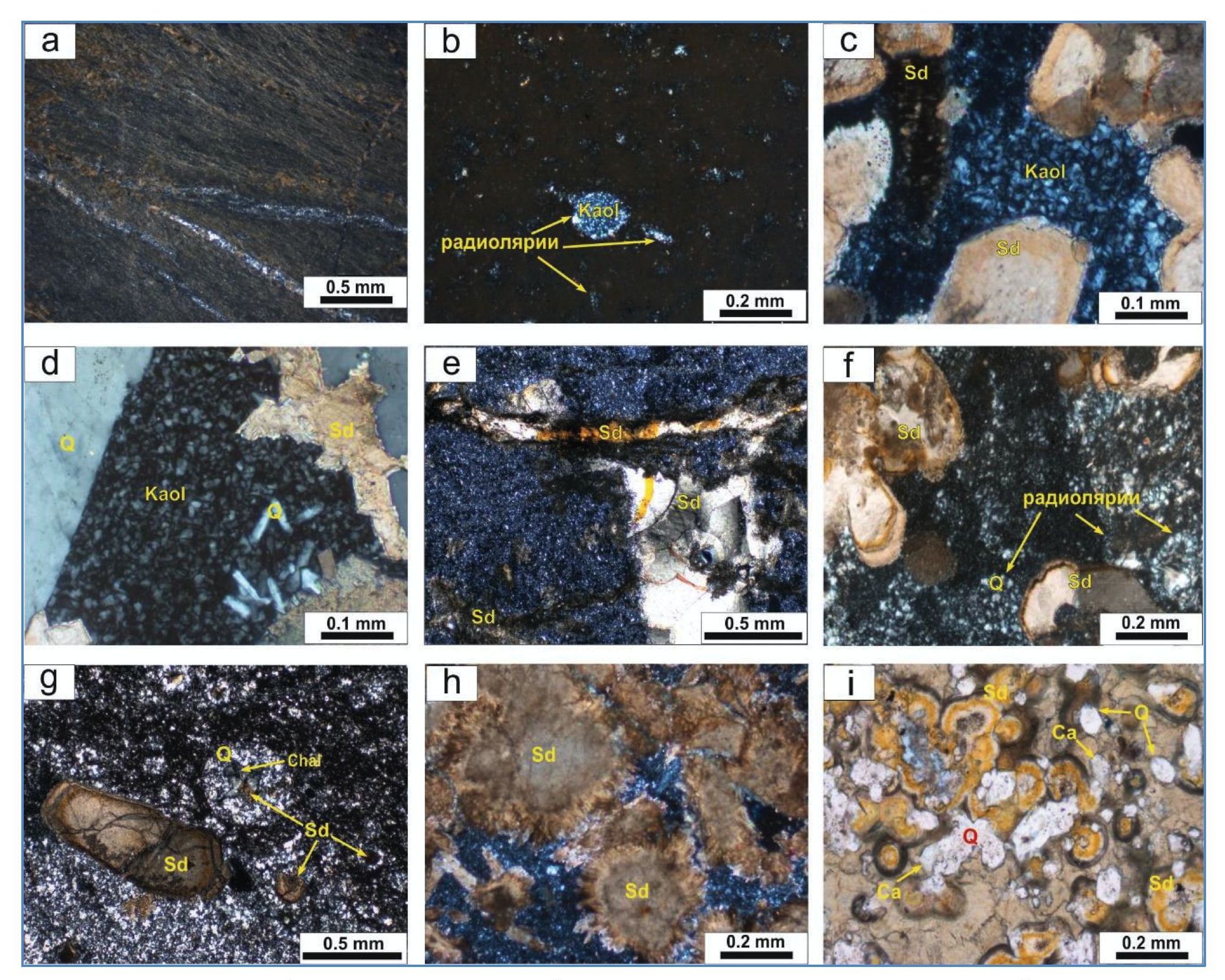 Рис. 6. Глинистые и карбонатные минералы в породах коры выветривания Калинового месторождения: a) агрегаты тонкочешуйчатой однонаправленной гидрослюды; b) чешуйчатый каолинит в остатке радиолярии; c, d) пакеты каолинита с сидеритом и кварцем в зонах метасоматоза; e, f) развитие сидерита в раковинах радиолярий и трещинах; g) удлиненные кристаллы сидерита с зональностью, частично ожелезненные; h) агрегаты сферосидерита с крустификационной оторочкой; l) оолитовые окисленные агрегаты и ксеноморфные зерна сидерита. Условные обозначения – на рис. 5. Фотографии a–h – с анализатором, i – без анализатора