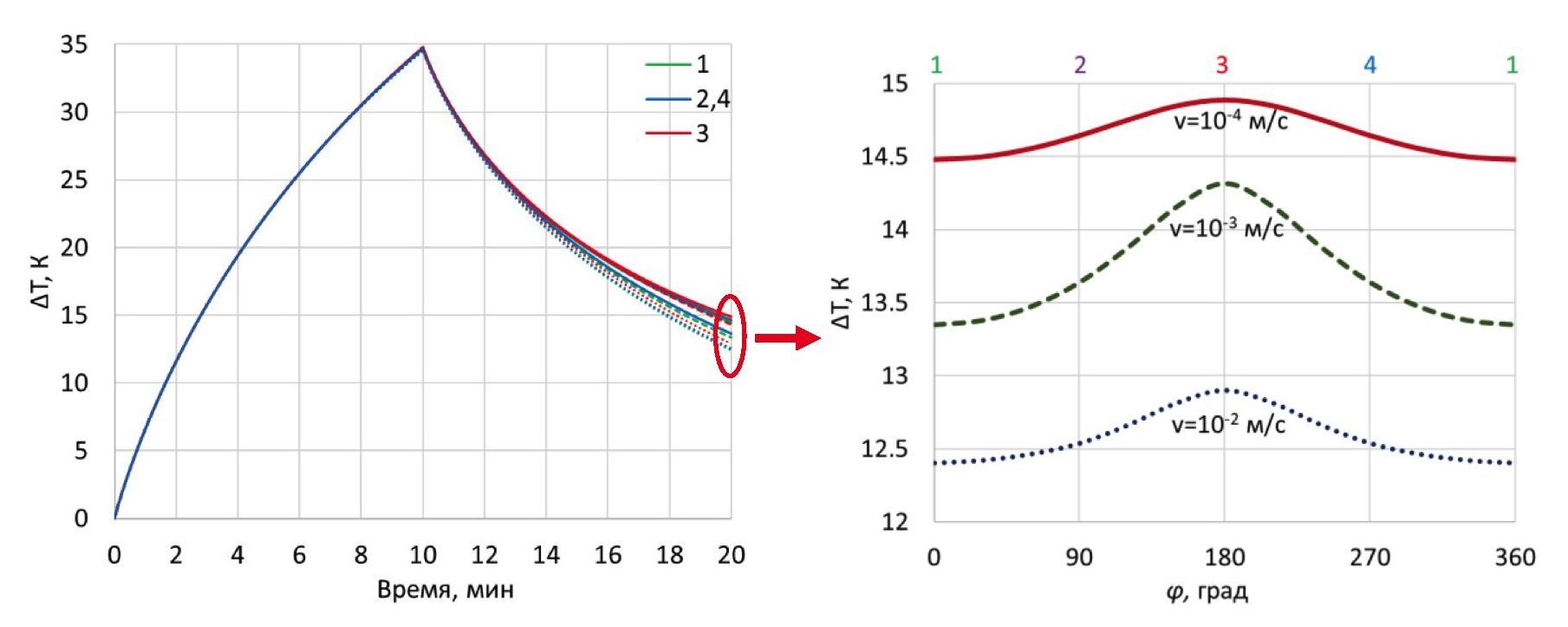 Различие в показаниях датчиков отмечается только после отключения индукционного нагревателя (рис. 4, б). Из кривых азимутального распределения температуры в колонне (где нулевой азимут соответствует ориентации точки 1 и противоположен направлению фильтрационного потока в пласте) через 20 мин после начала исследования (или 10 мин после отключения нагревателя) следует, что при увеличении скорости потока в пресноводном горизонте c 10–4 до 10–2 м/c максимальный разогрев колонны снижается с 14,9 до 12,9 К (в точке 3). Разница температур между точками 1–4 варьируется в диапазоне 0,4–1 К в зависимости от скорости потока в пресноводном горизонте.