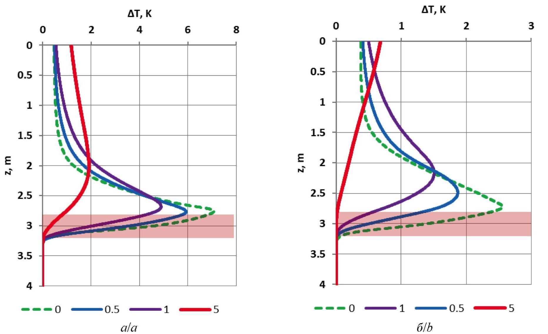 Рис. 7. Распределение температуры колонны по высоте при наличии заколонного перетока с различным расходом: а) через 1 мин после остановки нагрева; б) через 5 мин после остановки нагрева (шифр кривых – объемный расход жидкости в заколонном пространстве в м3/сут, цветом выделен участок нагрева колонны)