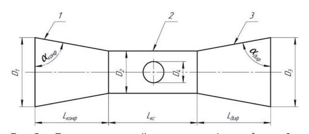 Рис. 2. Геометрия струйного насоса: 1 –конфузор; 2 – камера смешения; 3 – диффузор
