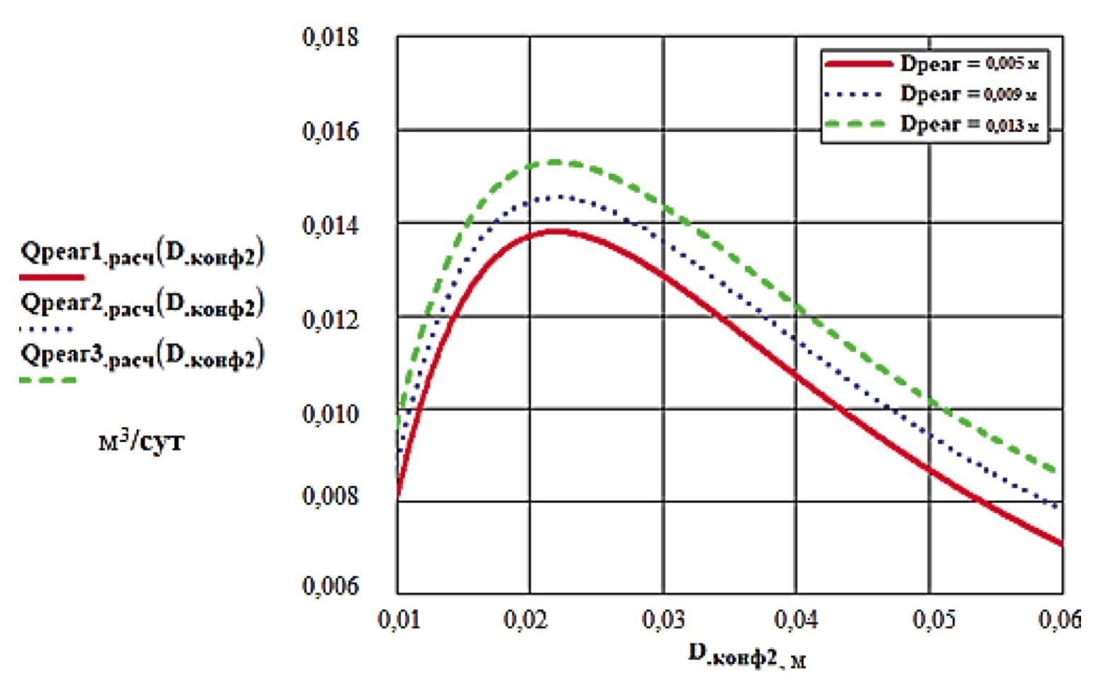 Зависимость расхода реагента от диаметра проходного отверстия насоса , дозирующего реагент, имеет параболический вид с ветвью, направленной наверх: при увеличении расход реагента возрастает вследствие снижения местных гидравлических сопротивлений в отверстии, дозирующем реагент. Подача насоса оказывает небольшое влияние на расход реагента: при увеличении подачи от 100 до 200 м3/сут максимальный расход реагента возрастает с 0,014 до 0,016 м3/сут (на 7 %). При этом для достижения требуемого расхода =0,0123 м3/сут при увеличении дебита скважины со 100 до 200 м3/сут диаметр проходного отверстия насоса, дозирующего реагент, должен увеличиться с 0,01 до 0,0128 м (на 28 %).