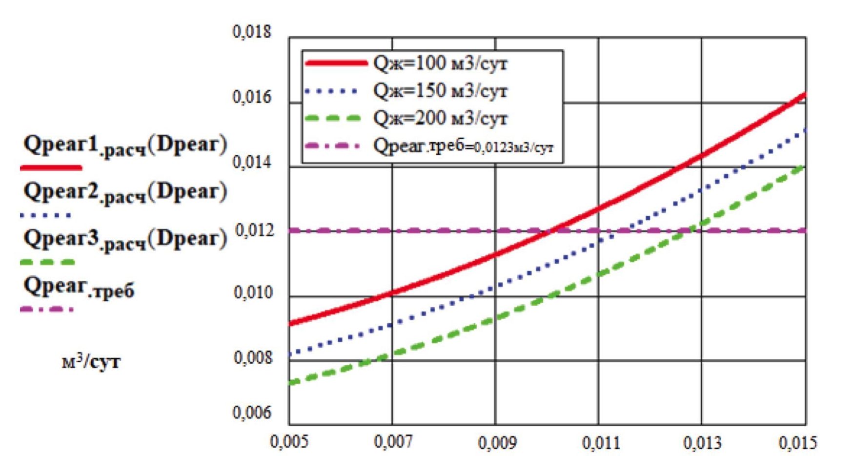 Рис. 4. Зависимость объемного расхода реагента от диаметра камеры смешения при различных значениях подачи УЭЦН