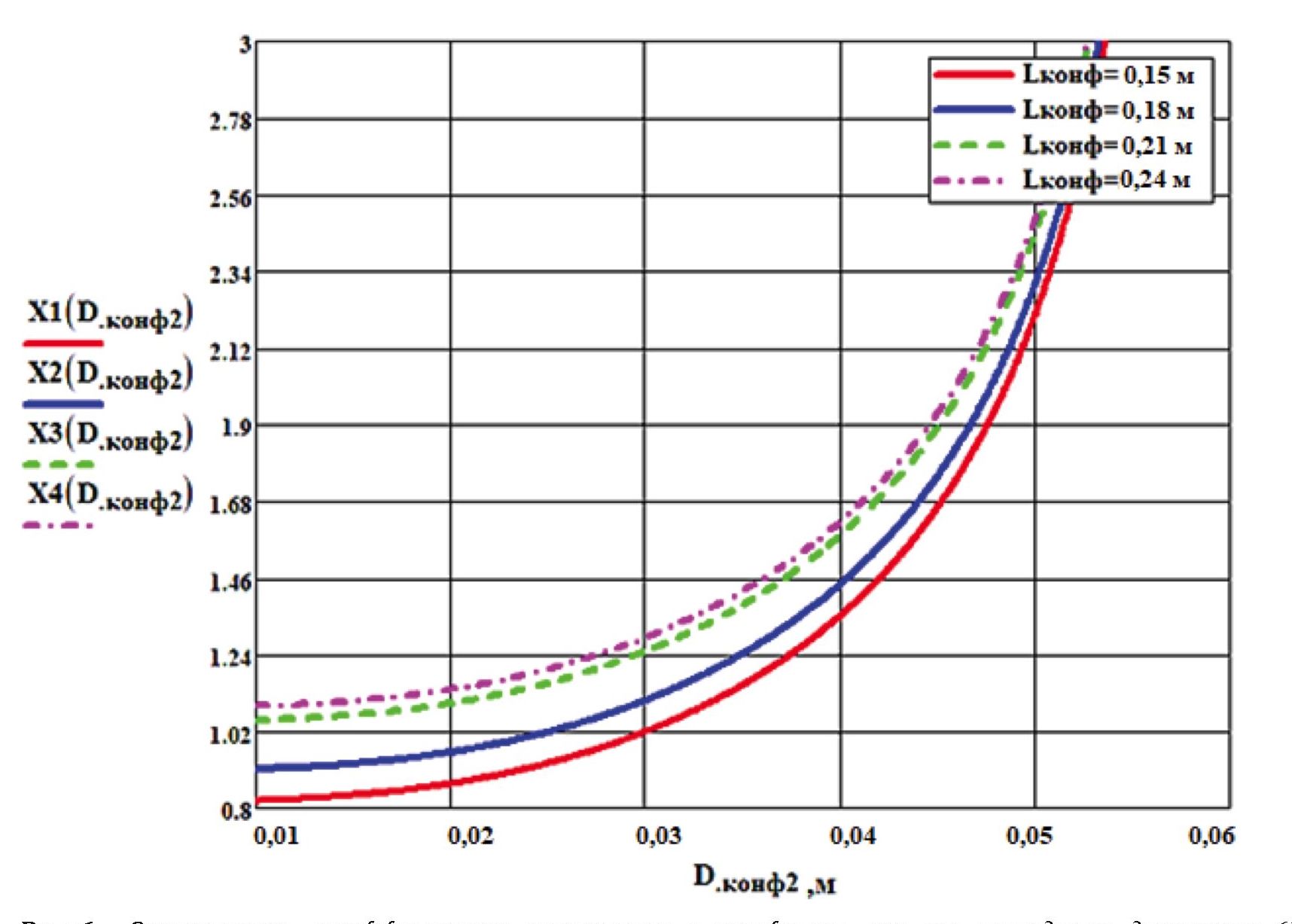 Рис. 6. Зависимость коэффициента кавитации в конфузоре от его выходного диаметра (диаметра камеры смешения) при различных значениях длины