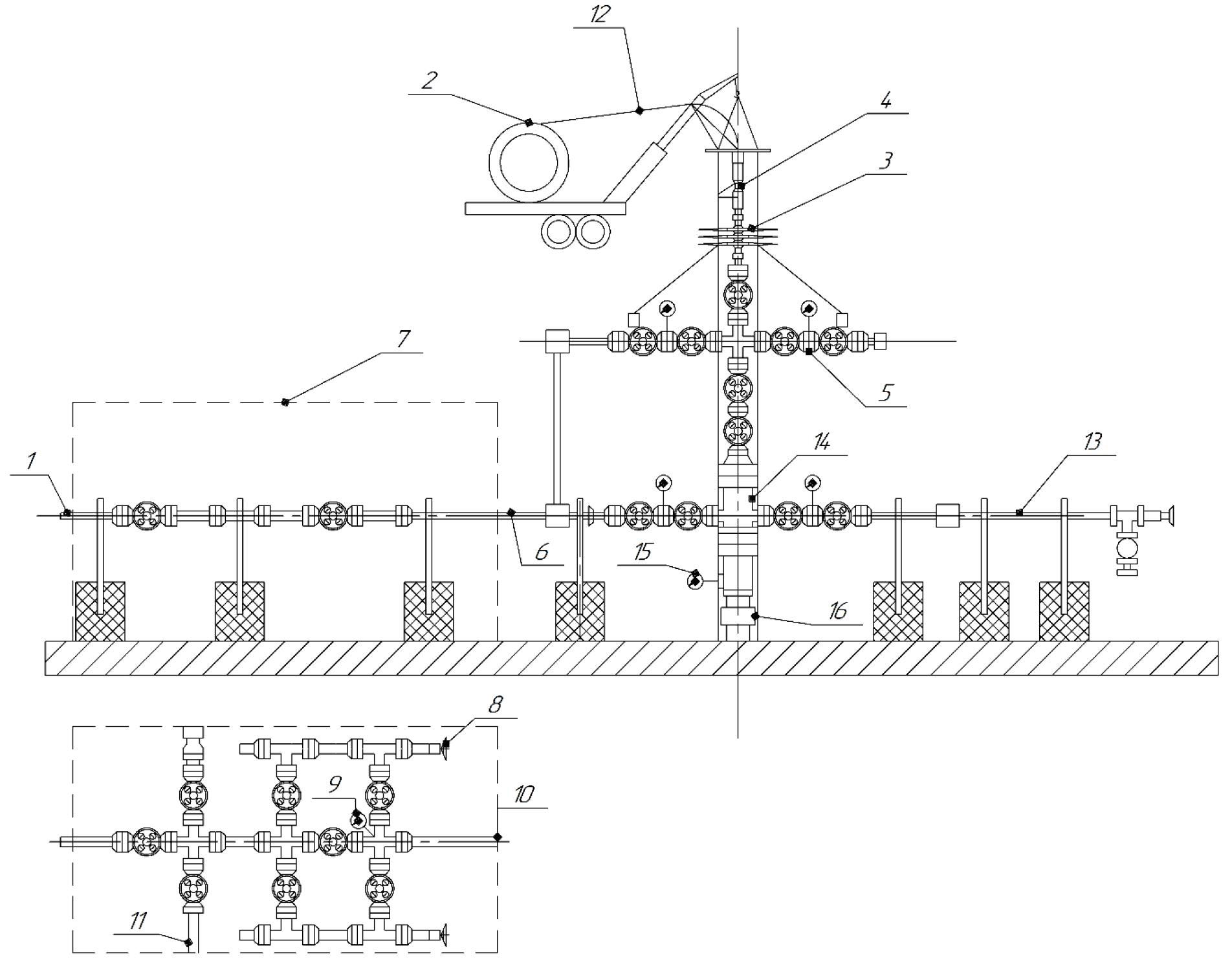 Fig. 3. Scheme of equipment placement at killing [compiled by the authors]: 1 – gas flare; 2 – coiled tubing unit; 3 – blowout preventer; 4 – tubing lubricator; 5 – production tree; 6 – outlet line; 7 – manifold unit; 8 – choke; 9 – coriolis flowmeter; 10 – non-return valve; 11 – separator inlet; 12 – coiled tubing; 13 – annular space control line; 14 – pipe head; 15 – high pressure gauge; 16 – casing head