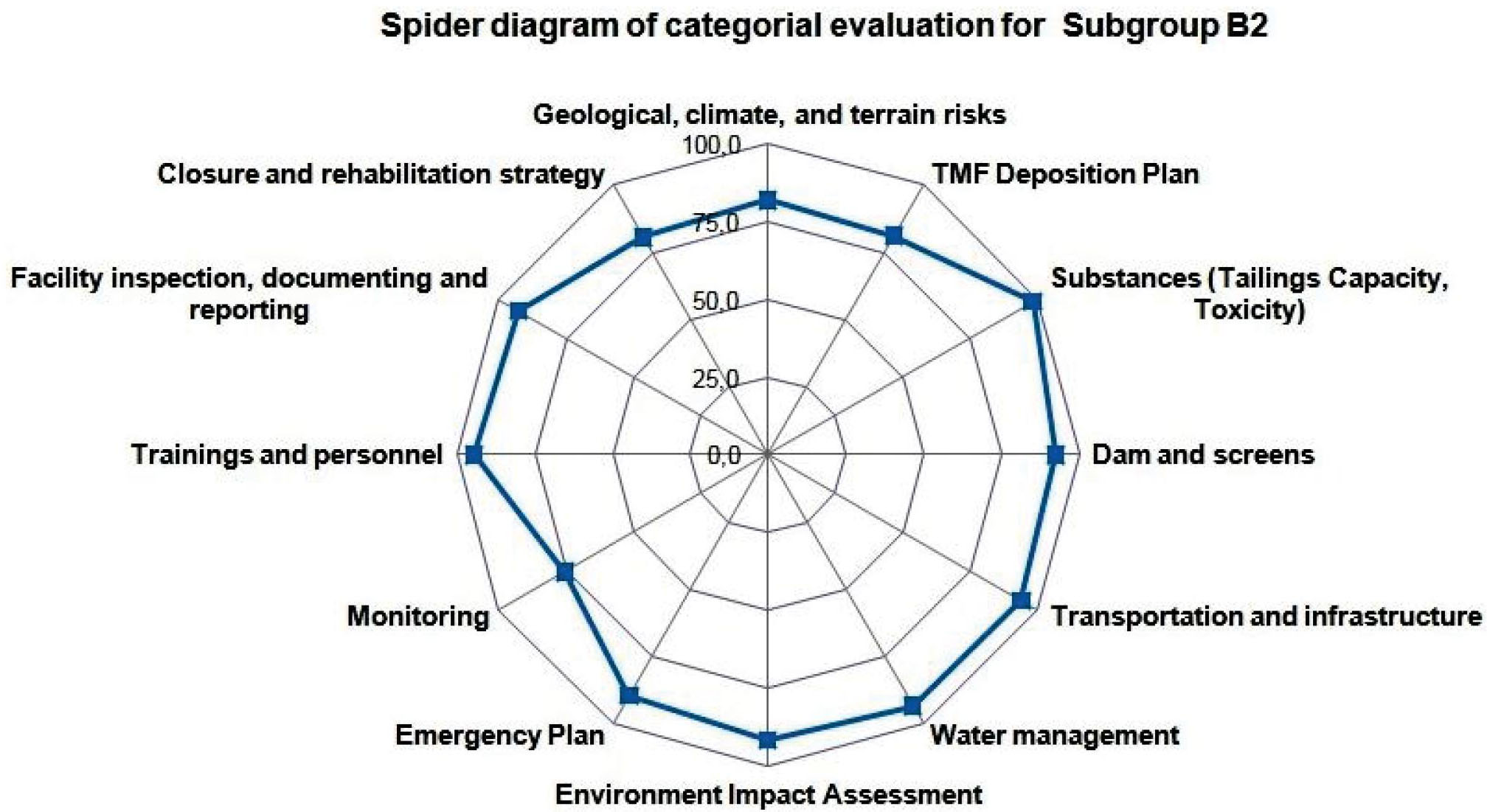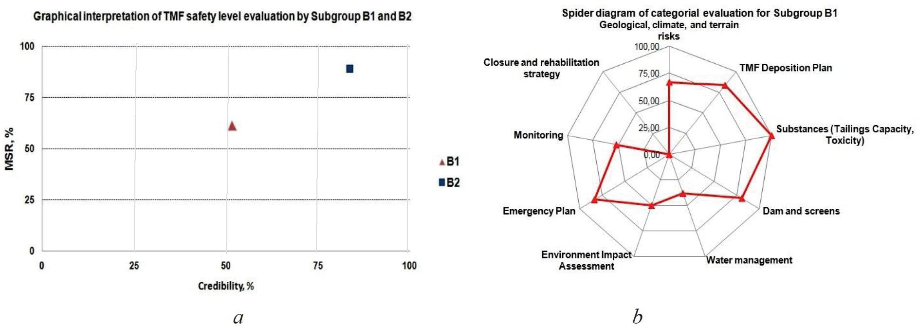 Evaluation of the results. The updated version of the TMF methodology (2019) for the TMF safety was applied to evaluate the safety level of the Nahatak TMF. The key novelties were (1) the equivalence of the evaluations obtained for visual and document checks, (2) introduction of the critical questions of doubled weight in comparison to general ones in both subgroups B1 and B2, and (3) more detailed categorial evaluation for visual check. The results of TMF safety evaluation are given in Table 2 and in Fig. 2, 3. The visual inspection provided answers to 35 questions of Subgroup B1 “Detailed visual inspection” with relevant justification/comments in column “S” of the Excel file, as well as to 259 questions of Subgroup B2 "Detailed Document Check". The evaluation matrix was filled in at the TMF site during a week after the field reconnaissance. The measures were proposed after checking the answers/evaluation matrix and having insight into the drone footage.