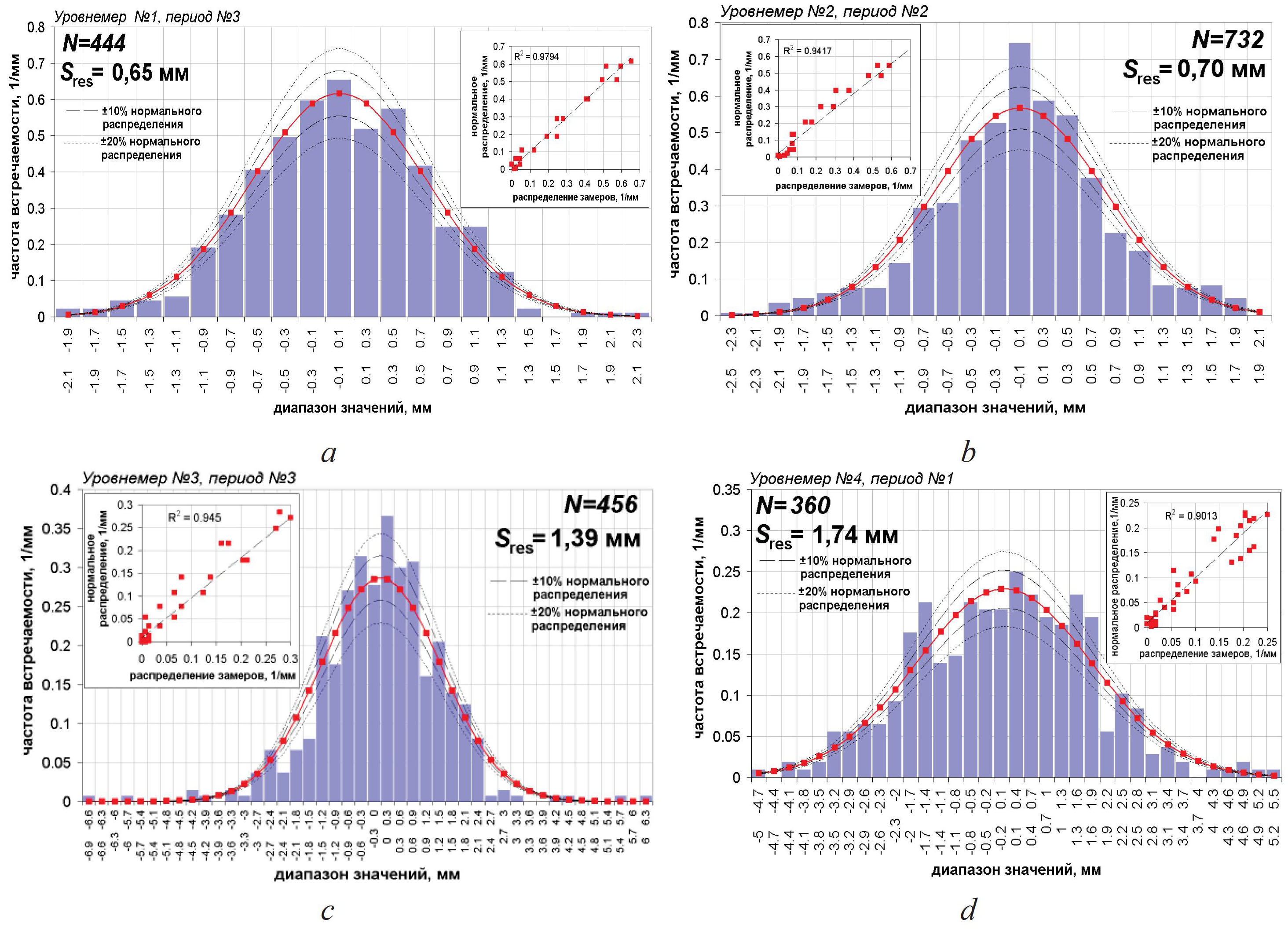 № п/п | Период измерений Period of measurements | Уровнемер Level gauge | Число точек измерения уровня Number of level measuring points (N) | sres, мм/mm | Коэф. лин. корреляции Linear correlation coefficient k | Отношение Ratio | AET, мм/mm | Амплитуды/Amplitudes of |