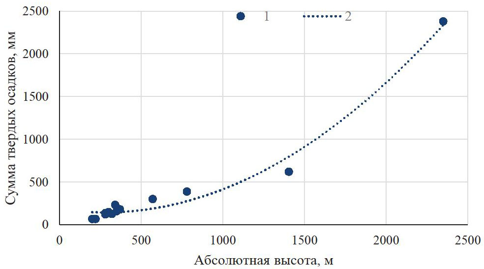 Рис. 2. График зависимости средней многолетней суммы твердых осадков от абсолютной высоты осадкомерного поста (бассейн р. Тубы). 1 – средняя многолетняя сумма осадков; 2 – линия тренда y = 0,0005x2 - 0,273x +178,89; R2 = 0,983, где x – абсолютная высота, м; y – среднемноголетняя сумма осадков за ноябрь–март, мм