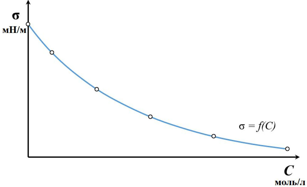 Что касается получения зависимости Шишковского, то здесь при проведении эксперимента часто используется так называемый капельный метод. Суть его заключалась в измерении на сталагмометре СТ-2 объёма капли исследуемого раствора ПАВ и определении величины поверхностного натяжения с дальнейшим расчётом и построением изотерм адсорбции. Для повышения точности эксперимента проводится 100 итераций для каждого раствора ПАВ с последующим расчётом среднего значения объёма капли. По полученным точкам строится аппроксимирующая зависимость Шишковского, которая даёт связь коэффициента поверхностного натяжения (КПН) с концентрацией ПАВ [6–9].