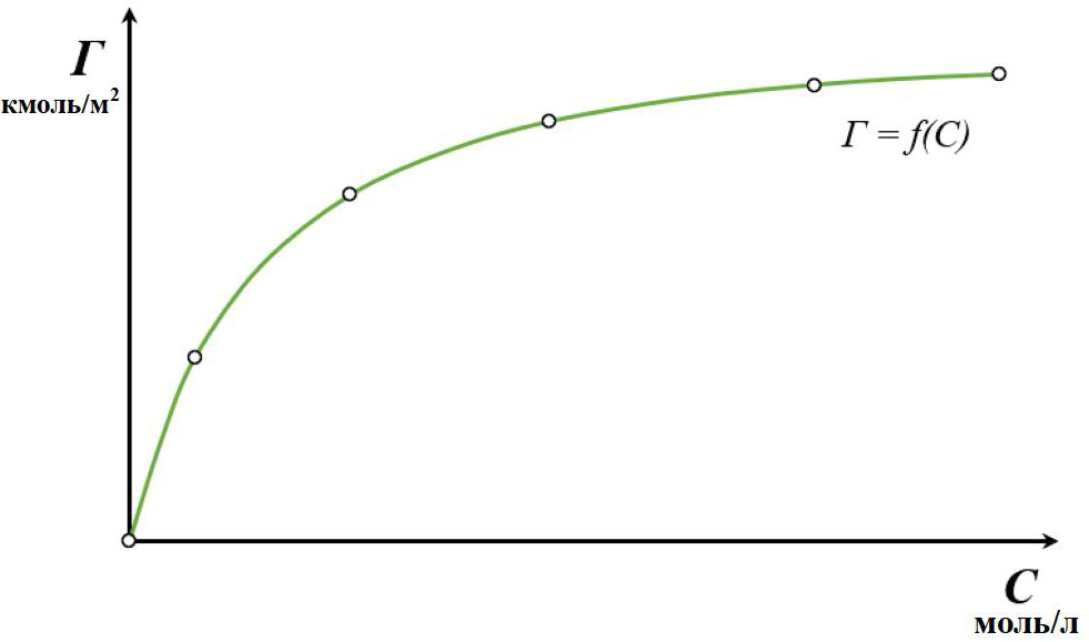 Простое термодинамическое соотношение между поверхностной концентрацией (адсорбцией), обозначаемой Γ, и изменением КПН с активной концентрацией растворяемого вещества σ было выведено Гиббсом:
