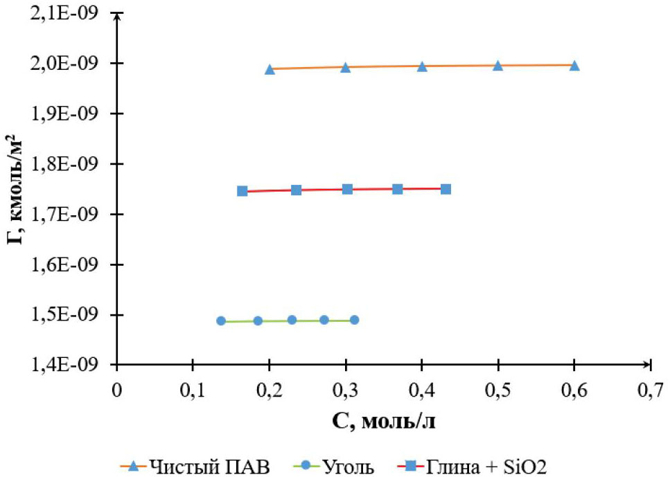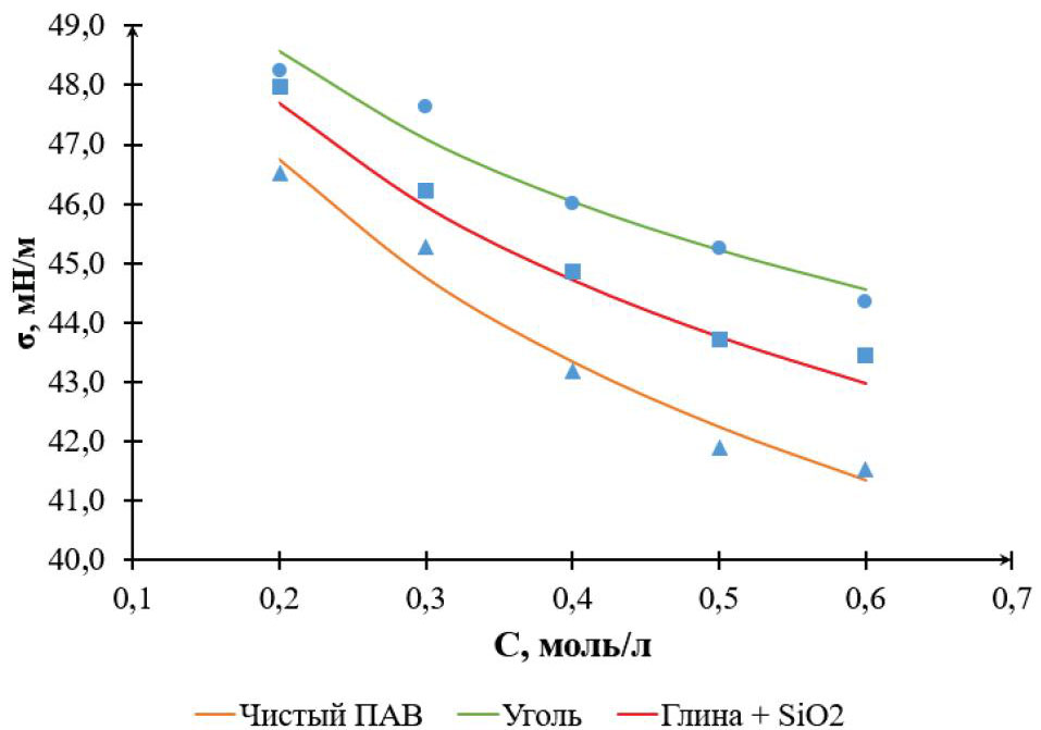 После применения метода наименьших квадратов и определения параметров зависимости уравнения Шишковского, которому подчиняются результаты рассматриваемого эксперимента, можно построить изотермы поверхностного натяжения (рис. 1), т. е. зависимость КПН раствора с ПАВ от концентрации ПАВ в растворе [13–16].