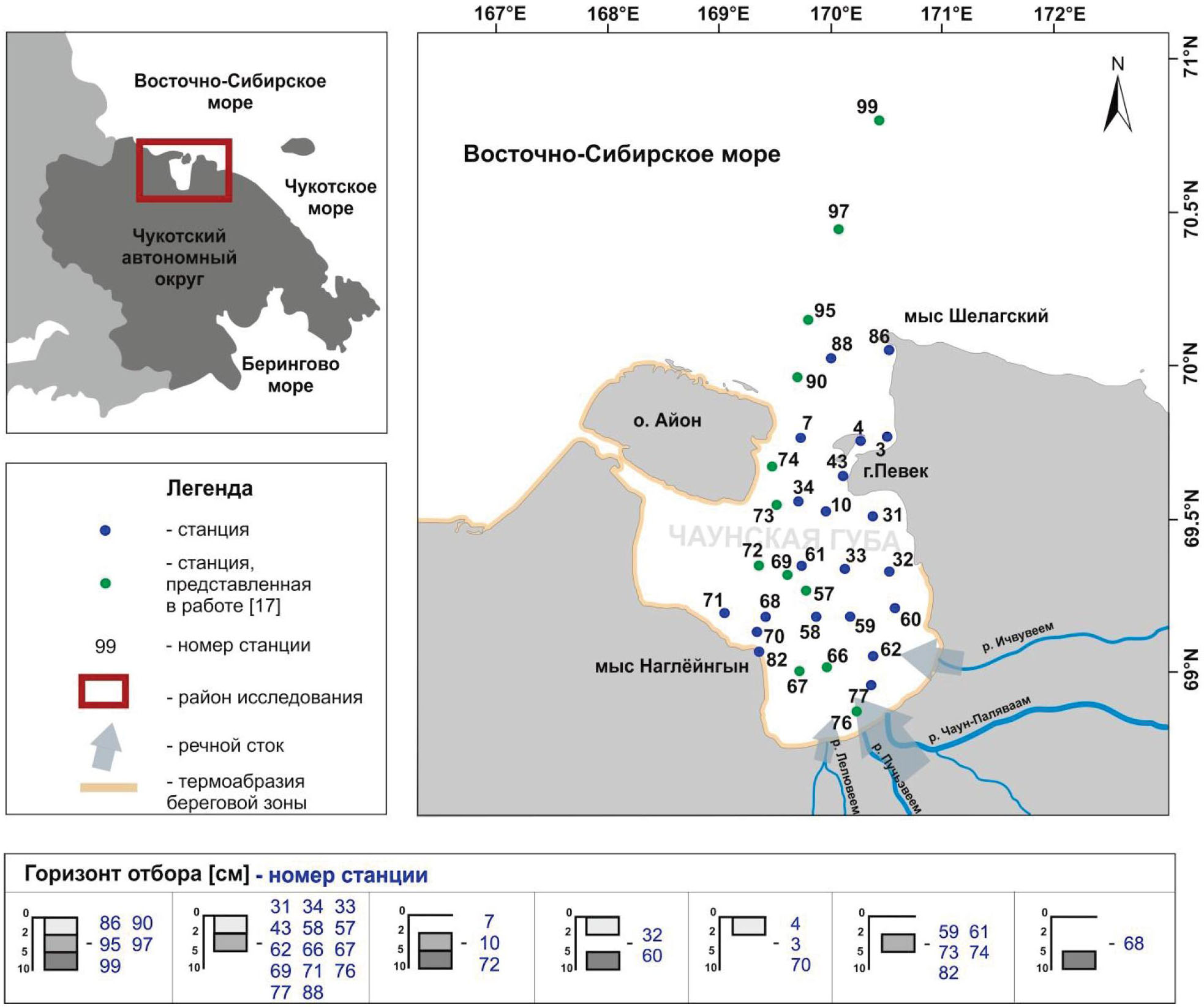 Objects. Samples of bottom sediments of the Chaunskaya Bay (East Siberian Sea). Sampling took place in stages from three horizons (upper 0–2 cm, intermediate 2–5 cm, lower 5–10 cm) during a comprehensive scientific expedition to the R/V "Academician Oparin" in September–October 2020.