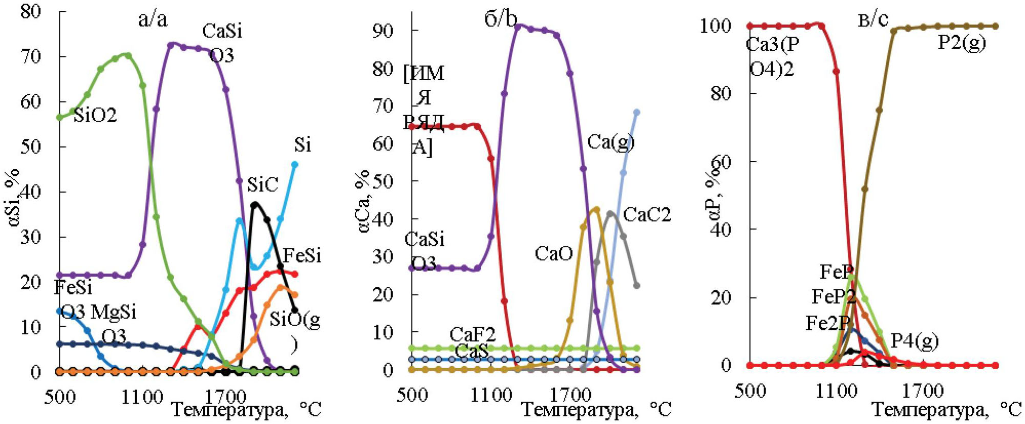 Из рис. 2 видно, что силициды железа образуются при температуре более 1220 °С, степень перехода кремния в FeSi–αSi(FeSi) составляет 23,42 % при 1900 °С. Переход αSi(Si) наблюдается при температуре более 1300 °С, возрастая до 46,04 % при 2200 °С. При температуре более 1700 °С αSi(SiC) возрастает, достигая максимума (37,5 %) при 1900 °С. Максимум перехода кальция в карбид кальция отмечается при 2000 °С и составляет 41,45 %. Начиная с 1070 °С фосфор переходит в газовую фазу, достигая 100 % при 1600 °С. В температурном интервале от 1070 до 1390 °С фосфор переходит в фосфиды железа.