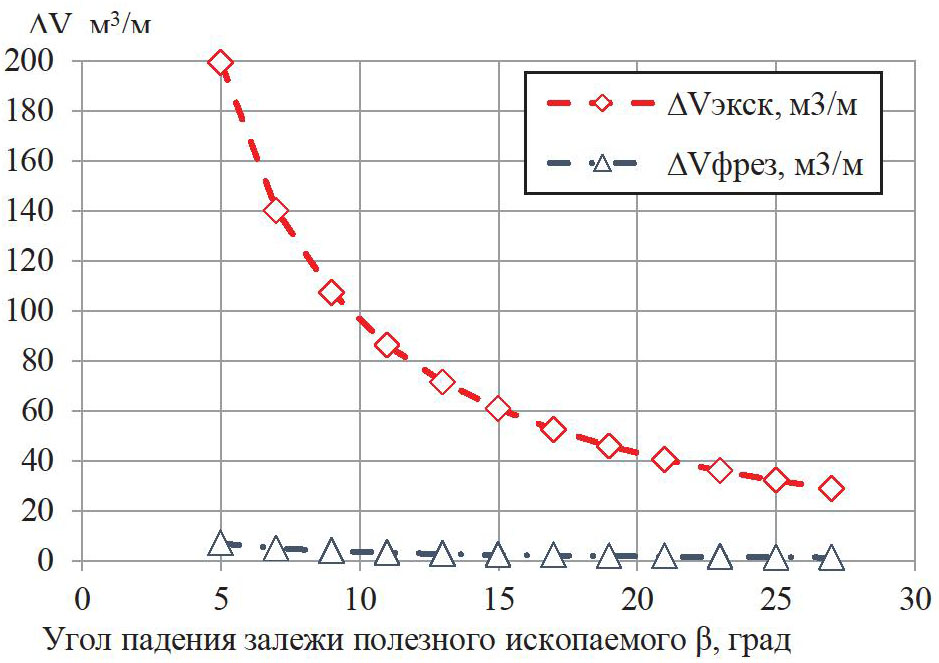 График зависимости объёмов разубоживания руды на контакте руда–порода от угла падения пласта руды (рудного тела) для горнотехнических условий отработки месторождения с использованием экскаватора и карьерного комбайна Surface Miner представлен на рис. 3.