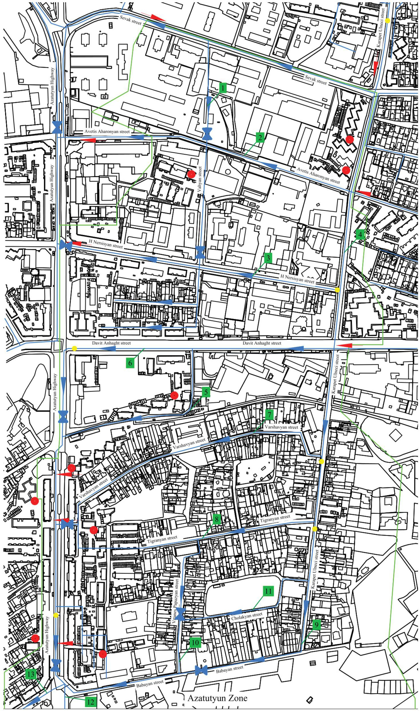 - to disconnect four of the seven connections going to other zones (Azatutyun–Aharonyan, Nersisyan, Zaryan crossroads, and near the Azatutyun 8 building) and provides water supply to deprived customers from the other It was considered to include the areas supplied by the remaining three connections within the project zone boundaries (near the buildings of Azatutyun 11 and 3, and the crossroads of Azatutyun–Babayan streets).