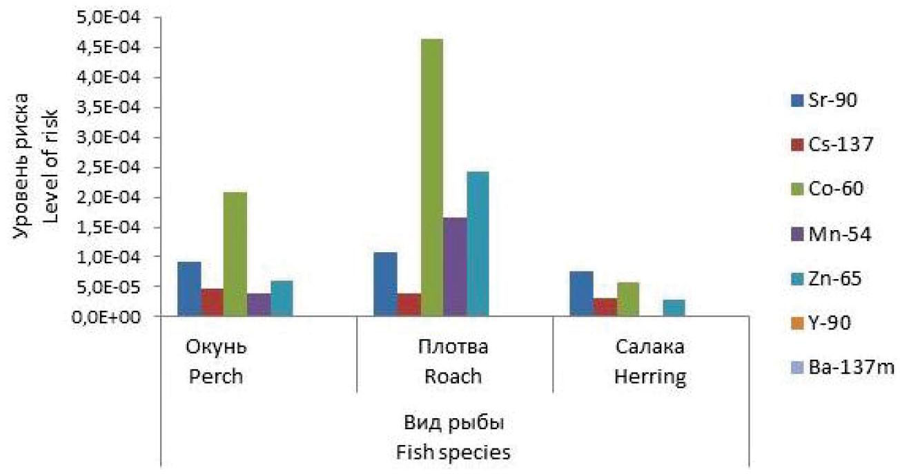 Оценивались риски облучения отдельно от каждого радионуклида, находящегося в организме рыб и в окружающей среде.