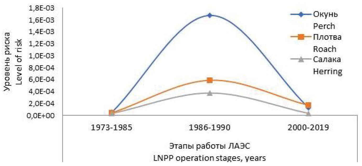 Формирование радиационных рисков у ихтиофауны водоема-охладителя ЛАЭС в период 1973–1985 гг. было в значительной степени связано с присутствием в водоеме радиоизотопов с наведенной активностью (60Co, 54Mn и 65Zn), образование которых может быть следствием работы ядерных реакторов АЭС. В период 1986–1990 гг. экологические риски у ихтиофауны Копорской губы были в основном вызваны последствиями радиационной аварии на Чернобыльской АЭС и загрязнением водоема 137Cs. В последние годы (2000–2019 гг.) радиационные нагрузки на ихтиофауну вызваны сочетанным воздействием радиоцезия и радионуклидов с наведенной активностью (14C; 60Co; 3H, 54Mn и 65Zn) при доминировании последних в процессе формирования суммарного экологического риска.