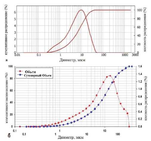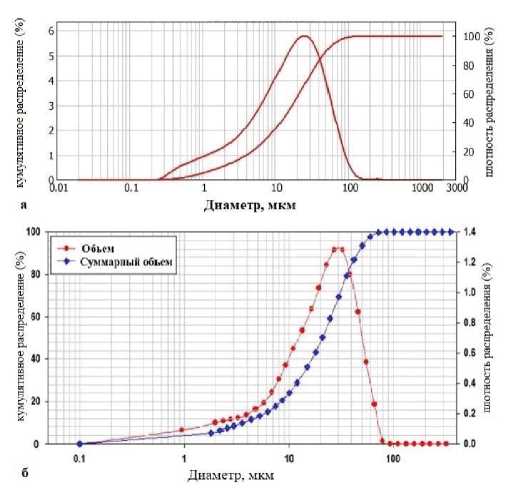 Рис. 2. Гранулометрический анализ цемента по размерам: а) собственные исследования; б) мировые исследования [10]