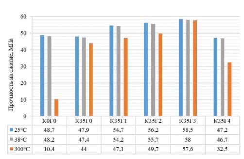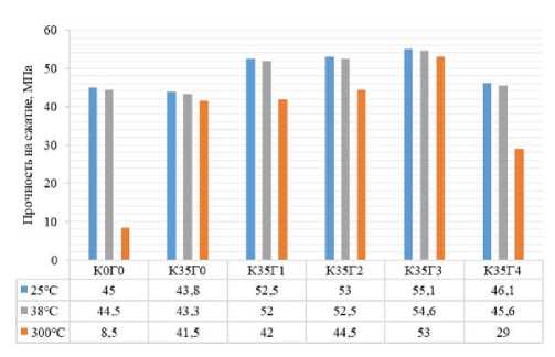 Рис. 5. Прочность на сжатие образцов, выдержанных при 25 и 300 °С (собственные исследования) и 38 °С [10] через 7 суток