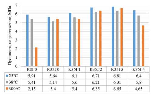 Рис. 8. Прочность на растяжение образцов, выдержанных при 25 и 300 °С (собственные исследования) и 38 °С [10] через 28 суток