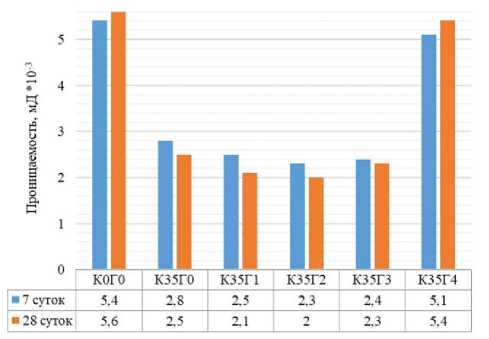Согласно рис. 9, базовый образец (К0Г0) имеет проницаемость 0,0054 и 0,0056 мД через 7 и 28 суток соответственно. Анализ полученных данных показывает, что ввод кварцевой муки приводит к снижению проницаемости на 48,1 % через 7 суток и на 55,4 % через 28 суток (образец К35Г0). Ввод наноглины (до 2 %) позволяет добиться снижения проницаемости дополнительно до 16,0 %, а по сравнению с базовым составом – до 62,5 %. При увеличении добавки наноглины до 3 % отмечено увеличение проницаемсоти образцов цементного камня с 4,3 % (через 7 суток твердения) до 15,0 % (через 28 суток). Дальнейшее увеличение доли наноглины (до 4 %) привело к значительному росту проницаемости: в 1,8–2,2 раза выше, чем у образца К35Г0, и в 2,2–2,7 раза выше по сравнению с лучшим результатом (при добавке 2 % наноглины).