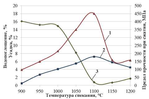 Для жидкостного спекания керамики необходимо образование при обжиге 30±5 мас. % расплава. В соответствии с вероятной кривой плавкости (рис. 1, кривая 3) при 1100 °С может образоваться 25,5 % расплава, а при 1150 °С – около 27 %, что достаточно для спекания керамического материала. Это дает основание предположить, что спекание композиции будет завершаться в интервале температур 1100–1150 °С. На рис. 2 представлены зависимости водопоглощения, усадки и прочности керамических образцов от температуры обжига в интервале 900–1200 °С.