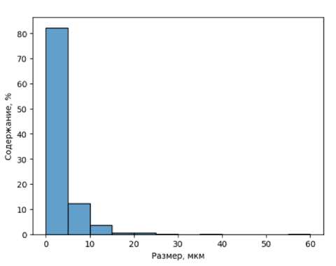 Анализ пористой структуры керамики показывает, что пористость составляет 14,0 %. Более 80 % пор имеют размер в диапазоне 0,1–5,0 мкм. Крупных пор размерами от 10 до 15 мкм менее 4 %. Количество пор размерами в диапазоне 5–10 мкм 12 % (рис. 4).