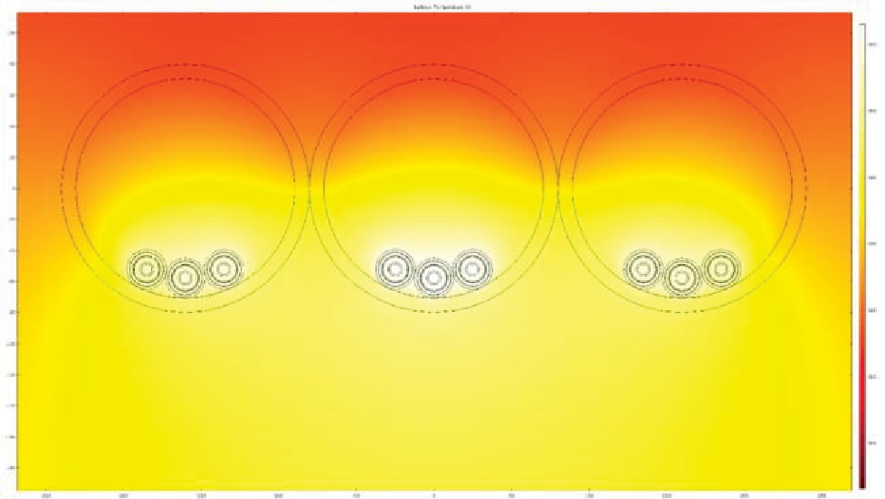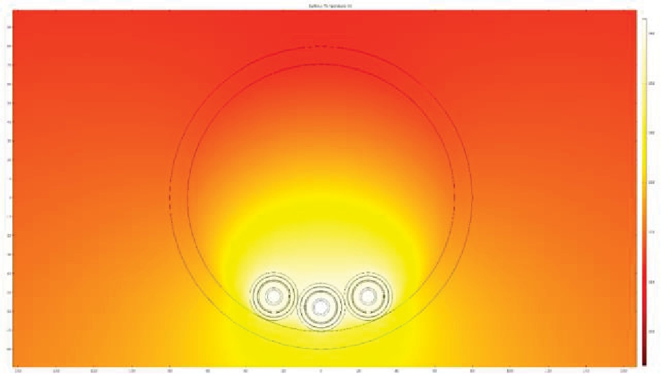 Для кабелей, проложенных треугольником, имеет место другая картина распределения температурного поля. Так как кабели касаются друг друга в двух точках, процессы теплопередачи будут проходить интенсивнее. В соответствии с ПУЭ данный способ прокладки возможен, а значит необходимо рассмотреть и его.