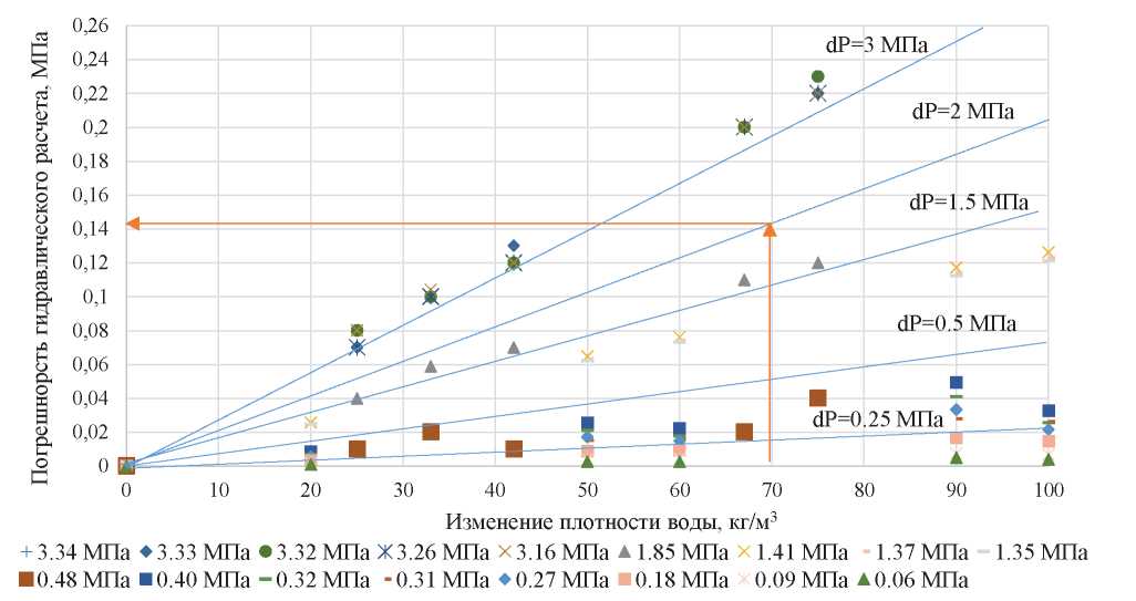 На номограмме приведен способ работы с ней: по известному изменению плотности (70 кг/м3) необходимо провести вертикальную линию до потерь давления на трение в рассматриваемом трубопроводе, после чего построить горизонталь влево до оси «Y» и определить, что погрешность гидравлических испытаний составляет 0,141 МПа. Полученное значение – погрешности выполнения гидравлических расчетов.