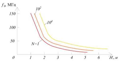Рис. 2. Расчетные значения f0 в зависимости от глубины зондирования H и числа накоплений N по данным [22] для плоскостных объектов