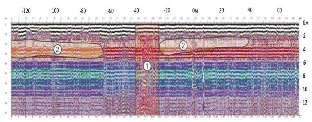 Fig. 3. Radarogram obtained at the site of the side of the Bachatsky coal mine: 1 – endogenous fire zone; 2 – collapse zone