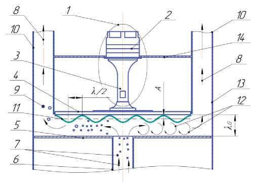 Рис. 1. Схема УЗ коагуляционной камеры: 1 – УЗ колебательная система (УЗКС); 2 – пьезопреобразователь; 3 – концентратор; 4 – дисковый излучатель; 5 – отражатель; 6 – входной патрубок; 7 – загрязненный газ; 8 – отходящий газодисперсный поток (к циклону); 9 – объединенные частицы; 10 – выходные патрубки; 11 – распределение амплитуд; 12 – вихревые течения; 13 – корпус; 14 – фланец излучателя; λ – длина волны изгибных колебаний; λG – расстояние между излучателем и отражателем