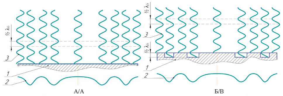 Рис. 2. Схемы формирования УЗ-излучения с помощью изгибно-колеблющихся ультразвуковых дисковых излучателей: А) излучатель с плоской фронтальной поверхностью (плоский); Б) излучатель с фазовыравнивающими кольцевыми выступами (ступенчатый); 1 – излучатель; 2 – распределение амплитуд колебаний; 3 – колебания, излучаемые в газовую среду; λG – длина волны в газовой среде