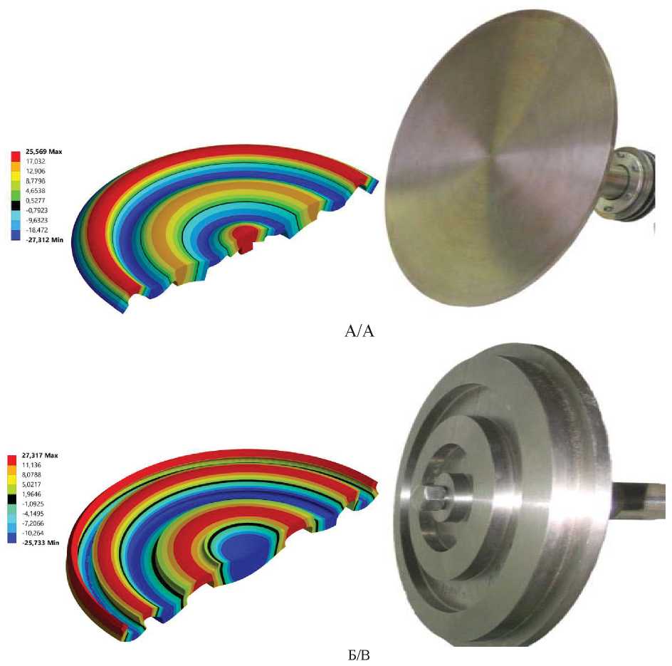Рис. 3. Форма колебаний и фото ультразвуковых дисковых излучателей: А) плоский излучатель; Б) ступенчатый излучатель