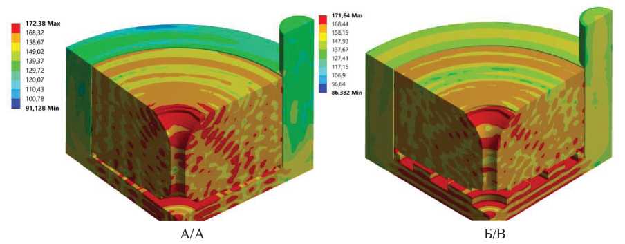 Рис. 4. Распределения уровня звукового давления внутри коагуляционной камеры: А) плоский излучатель; Б) ступенчатый излучатель