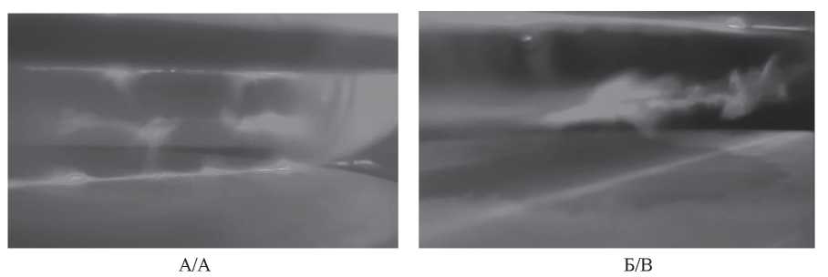 На первом этапе был проведен анализ траекторий движения частиц в коагуляционной камере с помощью разработанного стенда. Траектории частиц определялись на основании покадрового отслеживания трассирующих частиц, отснятых с помощью фотоаппарата. Выходная мощность генератора была установлена таким образом, чтобы уровень звукового давления при использовании обоих типов дисков был не менее 165 дБ. Полученные кадры съемки показаны на рис. 5.