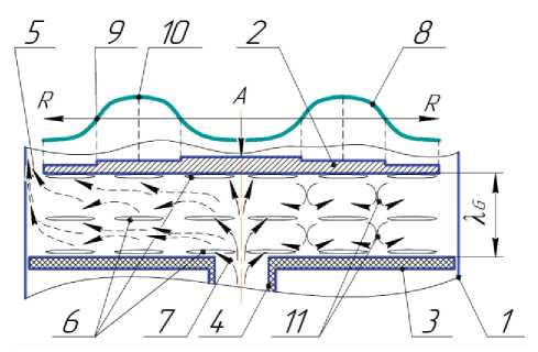 Рис. 6. Схема перемещения частиц в коагуляционной камере при использовании плоского излучателя: 1 – корпус камеры; 2 – излучатель; 3 – отражатель; 4 – входной патрубок; 5 –кольцевая область для выхода озвученного газодисперсного потока; 6 – области формирования агломератов; 7 – газодисперсный поток; 8 – распределение амплитуд колебаний дискового излучателя; 9 – нули колебаний излучателя; 10 – области максимальных амплитуд колебаний; 11 – вихревые области; λG – длина волны в газовой среде