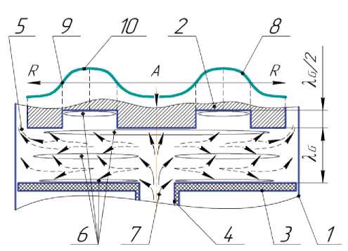 Рис. 7. Схема перемещения частиц в коагуляционной камере при использовании ступенчатого излучателя: 1 – корпус камеры; 2 – излучатель; 3 – отражатель; 4 – входной патрубок; 5 – кольцевая область для выхода озвученного газодисперсного потока; 6 – области формирования агломератов; 7 – газодисперсный поток; 8 – распределение амплитуд колебаний дискового излучателя; 9 – нули колебаний излучателя; 10 – области максимальных амплитуд колебаний; λG – длина волны в газовой среде