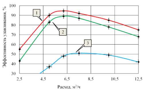 На рис. 8 представлены зависимости эффективности улавливания частиц от расхода газа.
