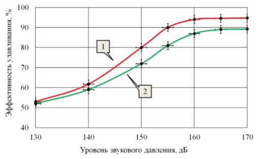 Рис. 9. Зависимость эффективности улавливания от уровня звукового давления: 1 – плоский излучатель; 2 – ступенчатый излучатель