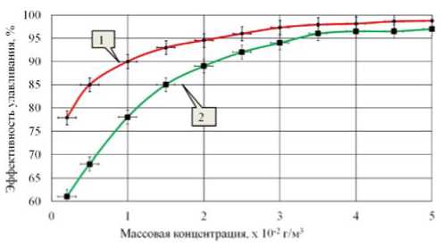 Рис. 10. Зависимость эффективности улавливания от массовой концентрации частиц: 1 – плоский излучатель; 2 – ступенчатый излучатель
