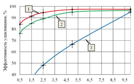 Рис. 11. Фракционная эффективность: 1 – плоский излучатель; 2 – ступенчатый излучатель; 3 – без УЗ-воздействия