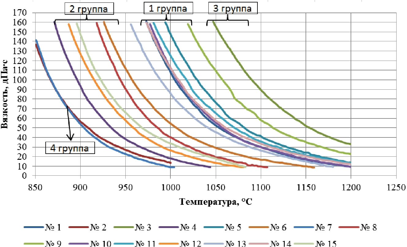 Из данных, представленных на рис. 3, следует, что в оптимальном диапазоне значений вязкости расплавов (от 35 до 100 дПа∙с) исследованные составы стекол можно разделить на четыре основные группы: