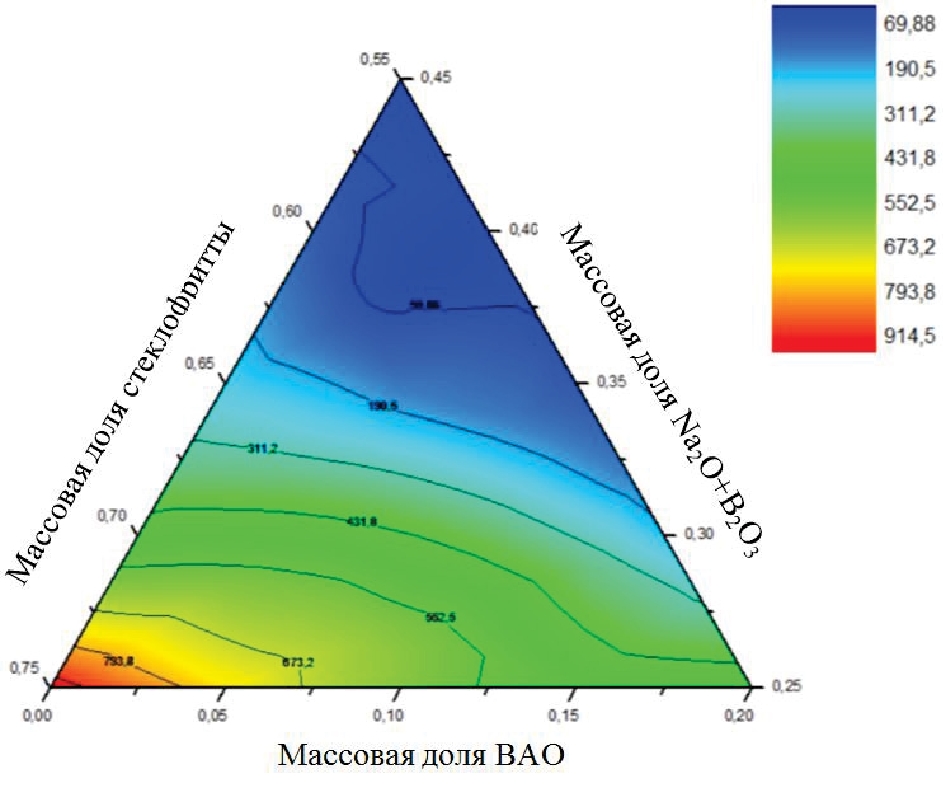 Из рис. 6 видно, что область стекол, у которых вязкость от 50 до 100 дПа∙с (темно-синяя область) при температуре 900 °С, расположена там, где содержание оксидов натрия и бора от 35 до 45 %, стеклофритты – 55 %, ВАО – от 0 до 10 %. Из рис. 7 видно, что область с вязкостью от 35 до 100 дПа∙с (от синей до зеленой области) при температуре 1000 °С расположена там, где содержание оксидов натрия и бора от 30 до 45 %, стеклофритты от 55 до 60 %, ВАО от 0 до 15 %.