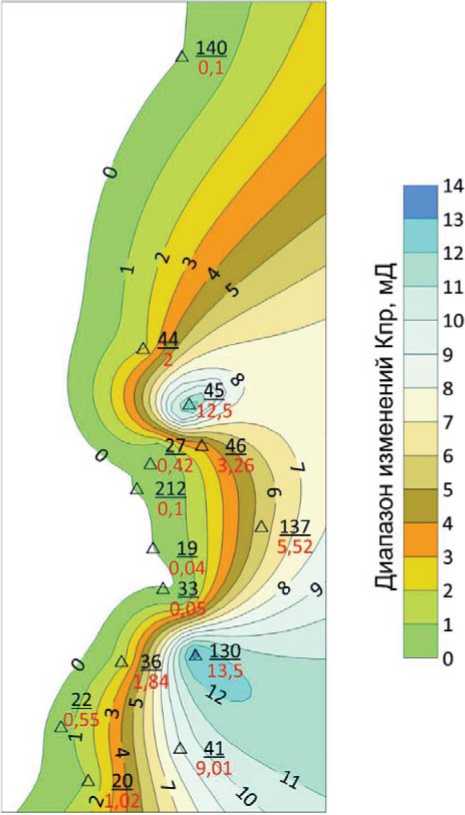 Значения параметра Кпр достигают максимальных отметок 13,5 мД в скважине № 130 и уменьшаются в направлениях на юго-запад и северо-запад (рис. 2).